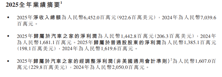 从全年业绩来看,汽车之家2025年净收入总额为人民币6,452.0百万元,2024年为人民币7,039.6百万元;2025年归属于汽车之家的净利润为人民币1,442.8百万元,2024年为人民币1,681.1百万元,同比下降约14%;2025年归属于普通股股东的净利润为人民币1,385.1百万元,2024年为人民币1,619.6百万元。