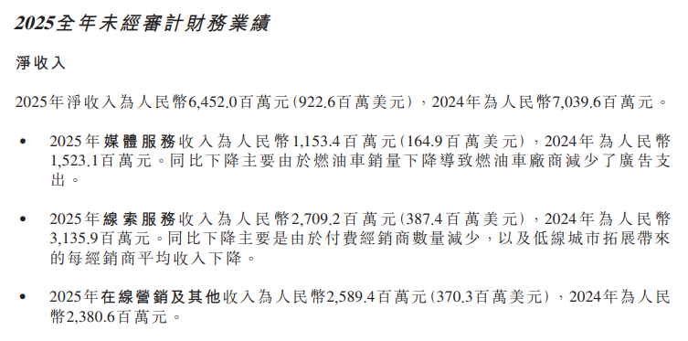 2025年,公司媒体服务收入为人民币1,153.4百万元,2024年为人民币1,523.1百万元。公司表示同比下降主要由于燃油车销量下降导致燃油车厂商减少了广告支出。