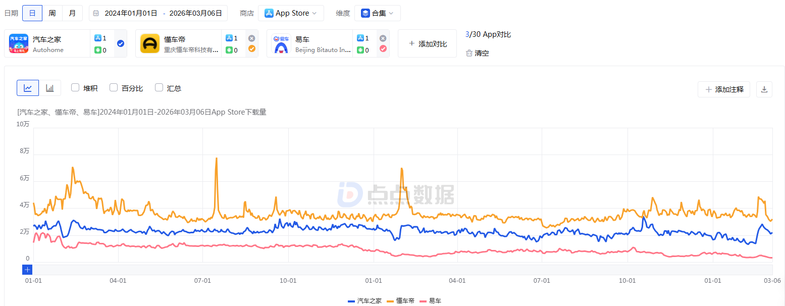 根据全球移动应用、游戏数据监测服务商点点数据的监测,近年来汽车之家在中国内地iOS平台的下载量保持相对平稳。相比同类平台,汽车之家近年来来自中国内地iOS平台的下载量高于易车,但低于懂车帝。