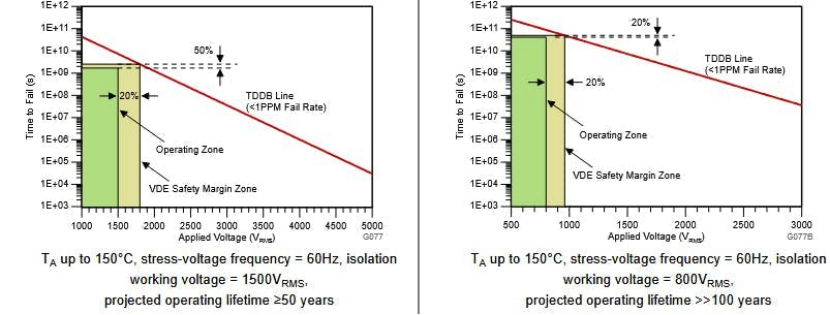 2. 由于严格的隔离电压等级要求,数据手册提供了基础型和增强型的屏障寿命性能图表。