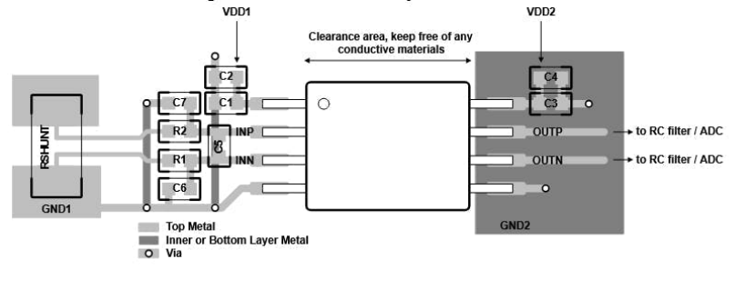 该布局要求对解耦电容及器件所需的其他元件进行关键位置(见图3)。TI还为工程师提供了可用于完善电路的具体元件指导,并提供了典型电流传感器到ADC信号链的示意图。