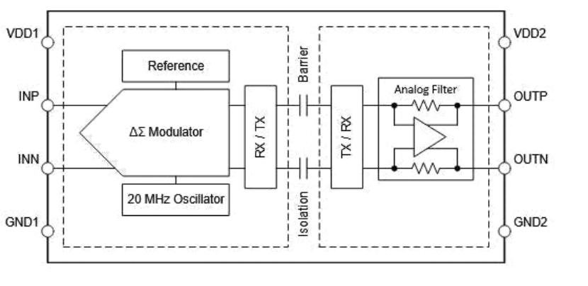 4. AMC0x02D 等置放大器的工作原理是先将输入信号数字化,然后利用开关键控技术将信号调制穿过二氧化硅电容势垒,进行后续解调。