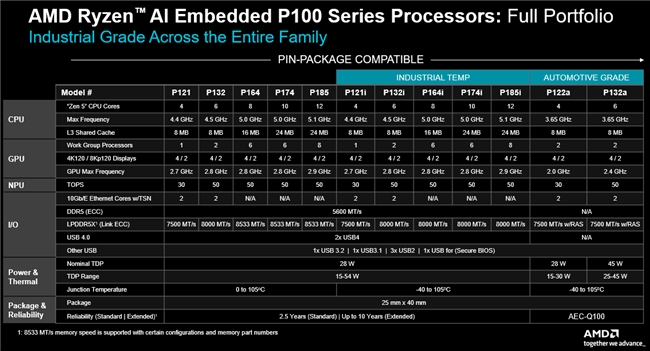 2 基于 AMD 于 2025 年 11 月进行的内部分析,比较了 AMD 锐龙 AI嵌入 P100 系列处理器的预期 TOPS 规格与 AMD锐龙嵌入式 8000 系列处理器的已公布 TOPS 规格。REP-001