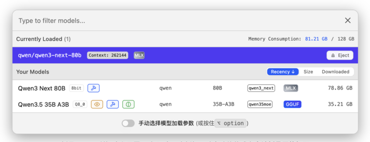 ▲ M1 Max 32GB考虑到部署的便捷程度,以及上下文理解的空间,我们选择通过 LM Studio 测试 qwen3.5-35b-a3b,以及支持 MLX 的 qwen3-next-80b,两者均为 8-bit 量化的 MoE 模型: