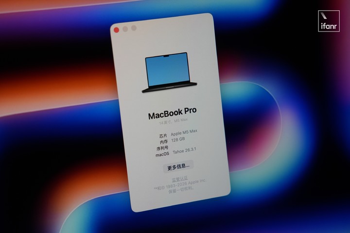 就拿爱范儿这台 14 寸 MacBook Pro 样机来说,我们收到的是今年最顶规的 40 核 GPU M5 Max 版本,搭配 128GB 统一内存和 8TB 硬盘,一台超过 5.5 万元的性能怪兽。