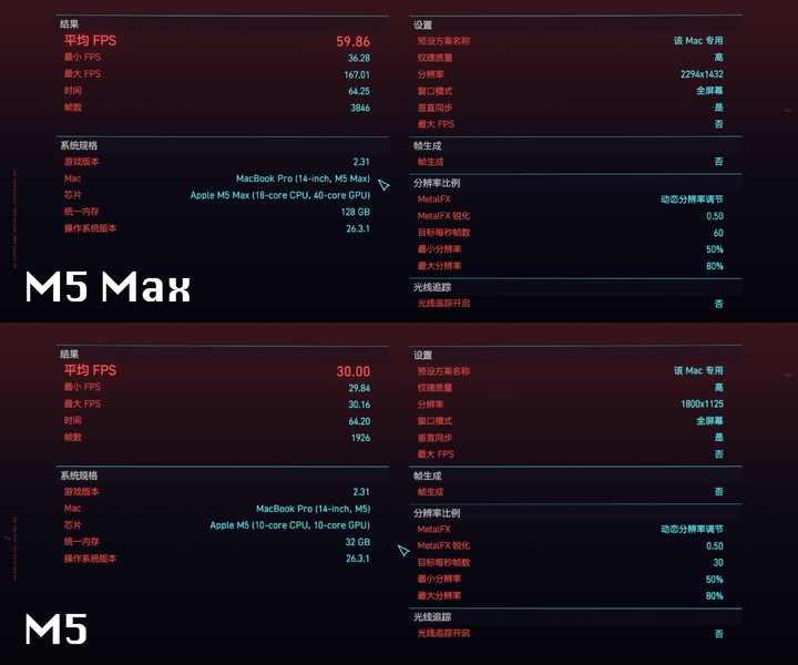 这个成绩距离游戏本当然差不少,但 2077 本来就是个非常庞大的游戏,M5 Max 能够在不插电的 14 寸机身里面跑出这样的效果,还是很让人惊喜的。