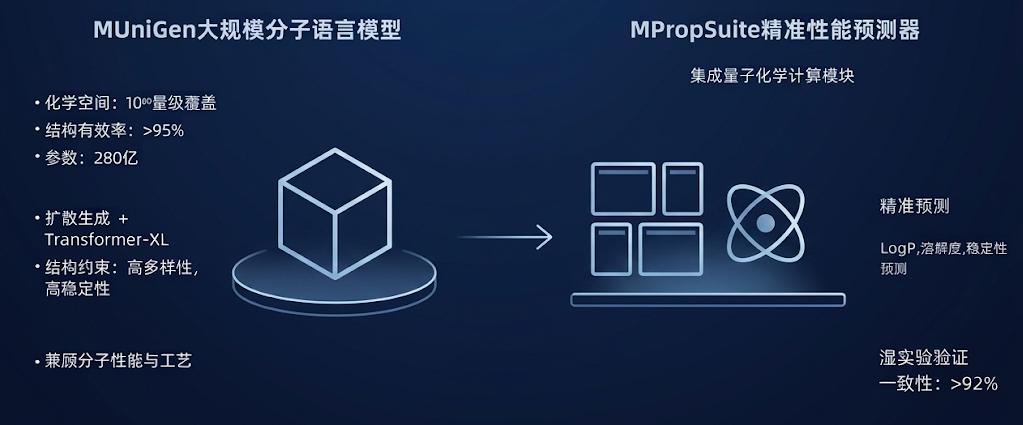 MUniGen 是 MetaNovas 自主研发的大规模分子语言模型,核心优势在于覆盖超广化学空间 —— 可高效覆盖 10⁶⁰量级的化学空间,有效结构率超 95%,模型参数规模达 280 亿,采用基于扩散生成机制的分子序列建模框架,在提升生成多样性的同时,结合结构约束与有效性筛选策略,降低无效或不稳定结构的生成概率。与传统分子生成模型相比,MUniGen 通过多模态数据训练,能更好地兼顾分子性能与工艺适配性,为后续的筛选与判断奠定基础。