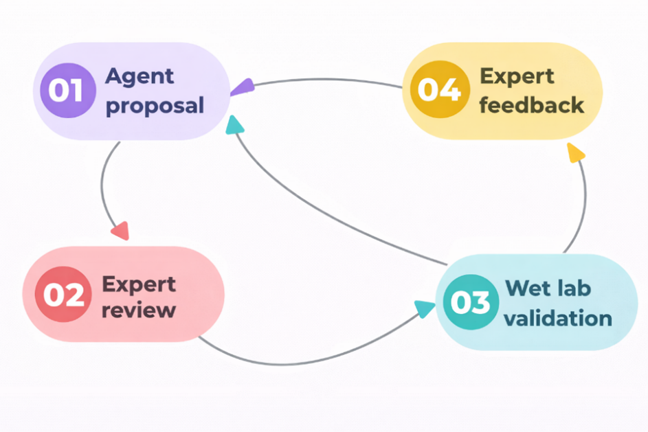 实验路径自主规划与经验学习:显式规划实验路径,记忆并学习实验失败经验,形成「Agent 提案→专家评审→湿实验验证→策略更新」的正向迭代闭环,持续提升研发效率;