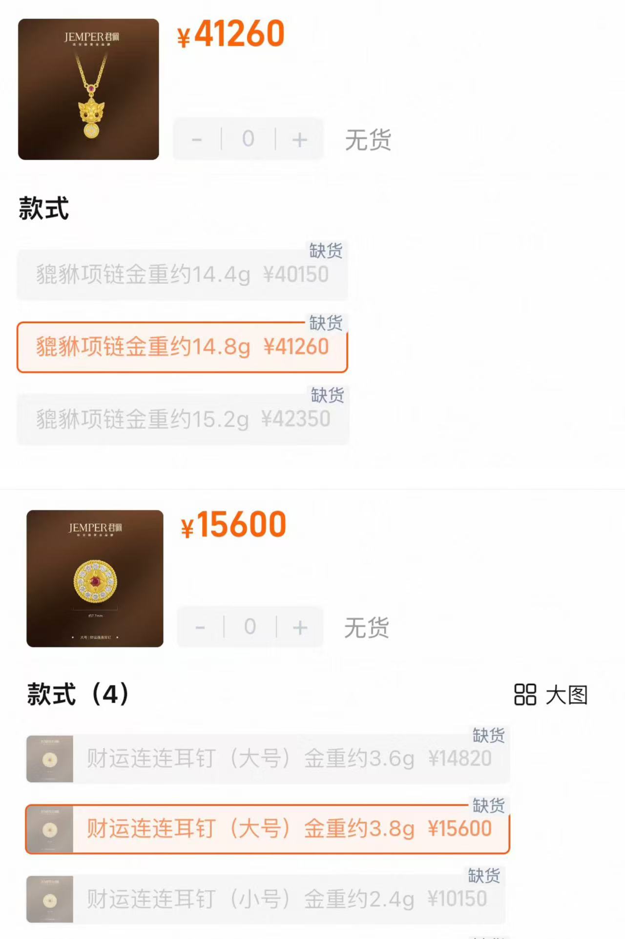 以君佩经典款mini貔貅项链为例,涨价前15克售价约29000元,克价约1933元;涨价后14.8克售价约41250元,克价飙升至2787元。更夸张的是,一款3.8克的财运连连耳钉售价达14932元,克价约合4105元。