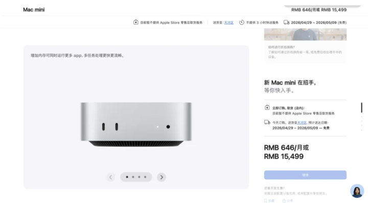 受此影响,苹果 Mac mini 在各大电商平台迅速售罄,苹果官网显示,现在下单最快要到 4 月底才能到手;并且一些二手平台上甚至衍生出了「租 Mac mini 养龙虾」的服务。
