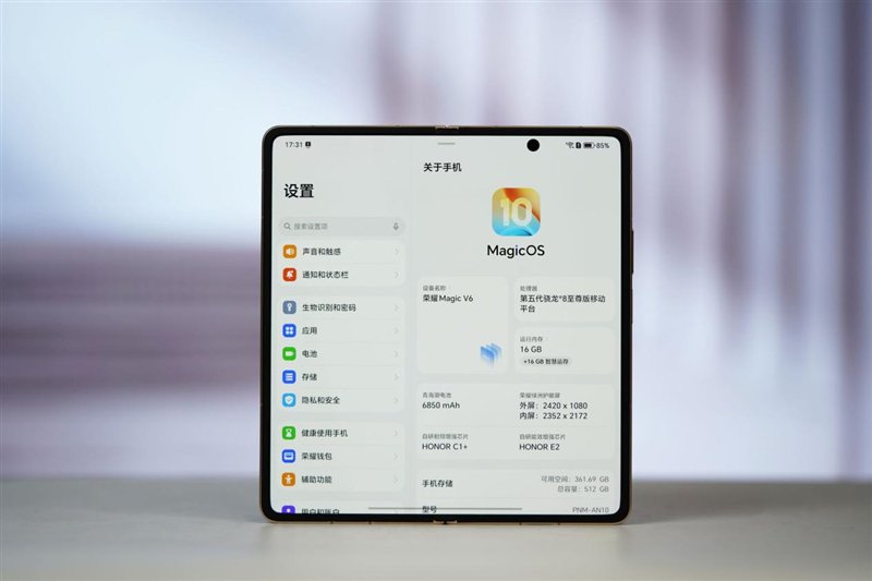 荣耀Magic V6屏幕方面,6.52寸外屏与7.95寸内屏均具备黑钻品质,支持4320Hz高频调光与绿洲护眼。外屏的金刚巨犀玻璃兼顾抗反射与超强耐磨,内屏则升级超韧UTG玻璃,抗冲击力比肩直板机。