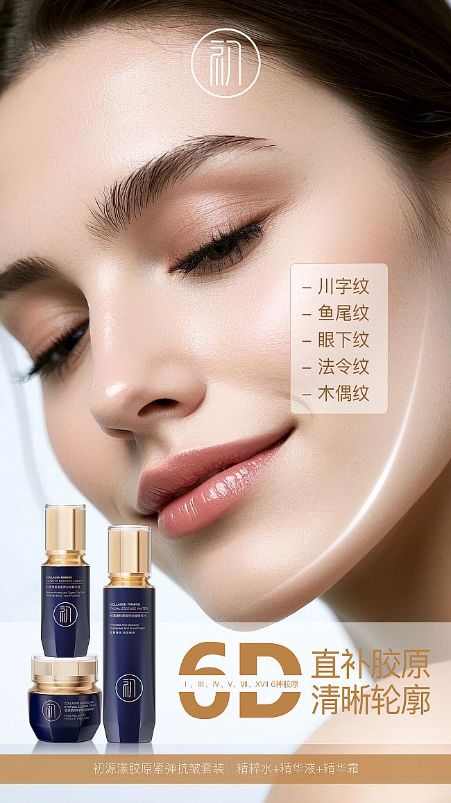 前沿6D胶原抗皱技术,基于肌肤胶原结构研发,精准匹配人体肌肤六大关键胶原,采用重组人源化技术,成分活性更高、渗透力更强,实现表层修护、中层充盈、底层支撑的全维度抗皱。