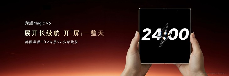 荣耀Magic V折叠屏系列自诞生之日起,就在不断刷新折叠行业品类上限。此次荣耀Magic V6不仅在极致轻薄上持续引领,更首次将折叠屏电池容量带入7000+mAh时代,续航实力跨代领先。内外均采用荣耀自研至臻黑钻屏,国际顶级七大权威认证诠释顶级屏幕素质。全新荣耀盾构钢铰链和超强整机防尘防水,将可靠性拉满。同时,凭借满血性能和出色影像配置,以及全新AI生产力和跨生态互联体验,带来从内核到外观,从硬件到软件的“折叠屏大满贯”实力。