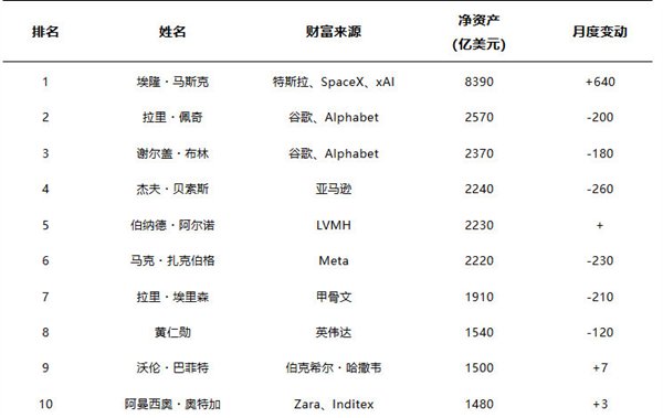 进入榜单前十名的还有英伟达创始人黄仁勋(1540亿美元)、沃伦·巴菲特(1490亿美元)和西班牙时尚巨头阿曼西奥·奥尔特加(1480亿美元)。