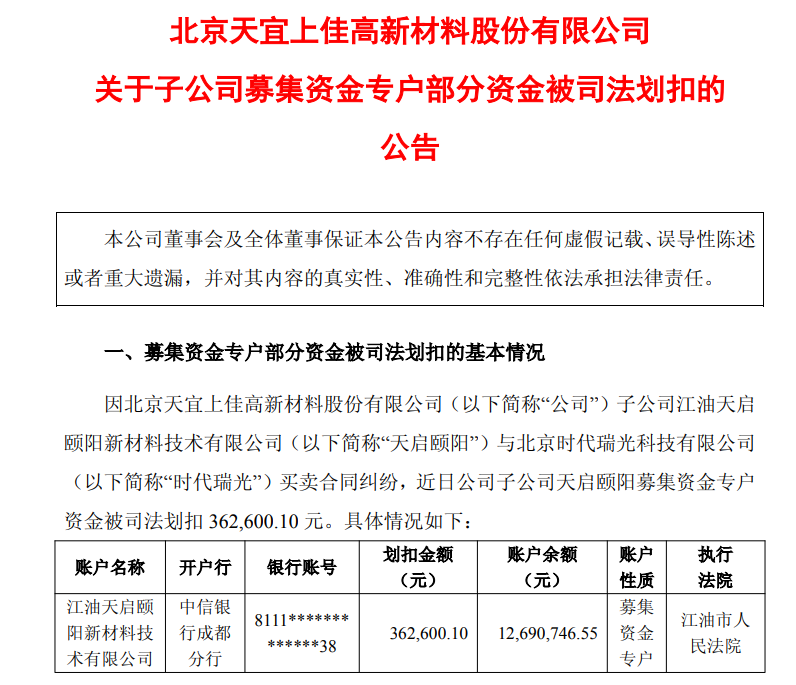 近日,天宜新材公告称,公司子公司江油天启颐阳新材料技术有限公司(以下简称“天启颐阳”)与北京时代瑞光科技有限公司(以下简称“时代瑞光”)买卖合同纠纷,公司子公司募集资金专户资金被司法划扣36.26万元。