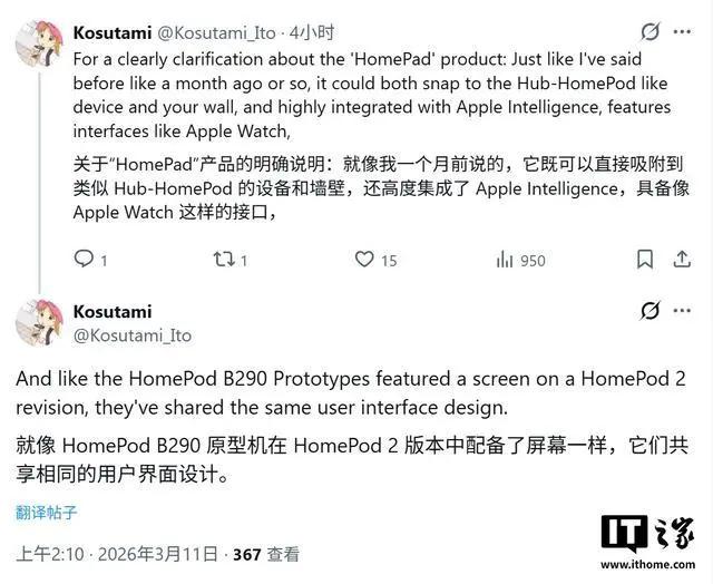 3 月 11 日消息,消息源 Kosutami 今天(3 月 11 日)在 X 平台发布推文,透露苹果智能家居中枢(HomeHub 或叫 HomePad)将采用类似 watchOS 的操作界面,并原生支持 MagSafe 磁吸技术。