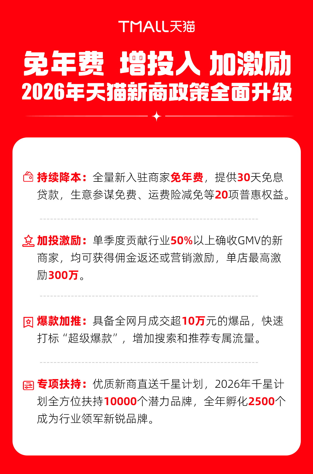3月10日,天猫举办新商、潜力商家大会,宣布2026年持续降低商家成本,免年费,追加经营激励,加大专项扶持投入。