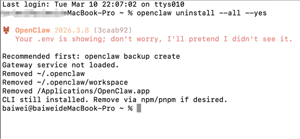 上面的指令跑完后,你的电脑里就只剩下 OpenClaw 的外壳(CLI 工具)了。如果你想把它也彻底送走,再执行一行——代码块:npm uninstall -g openclaw。
