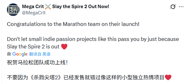 3月6日当天,Mega Crit发布了一条祝贺《马拉松》游戏上线的推文,并且特别提到“不要因为《杀戮尖塔2》发售,就把这种充满热情的小型独立作品给忽略了。”