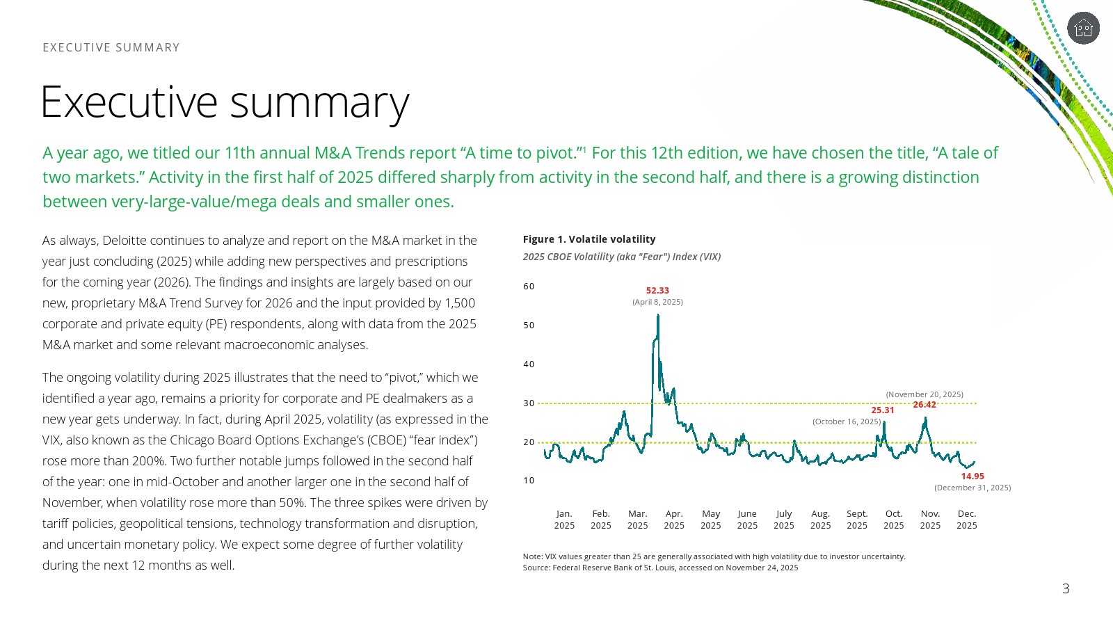 2025年全球并购市场呈现明显的结构性分化特征。德勤对1500名企业与私募股权高管的调查显示,超过80%的受访者预计未来12个月交易数量和总价值将高于2025年,乐观情绪延续疫情后的恢复趋势。但与此同时,市场波动显著加剧,VIX指数在2025年4月一度飙升至52.33,全年多次大幅波动,表明宏观环境仍处于高度不确定状态。