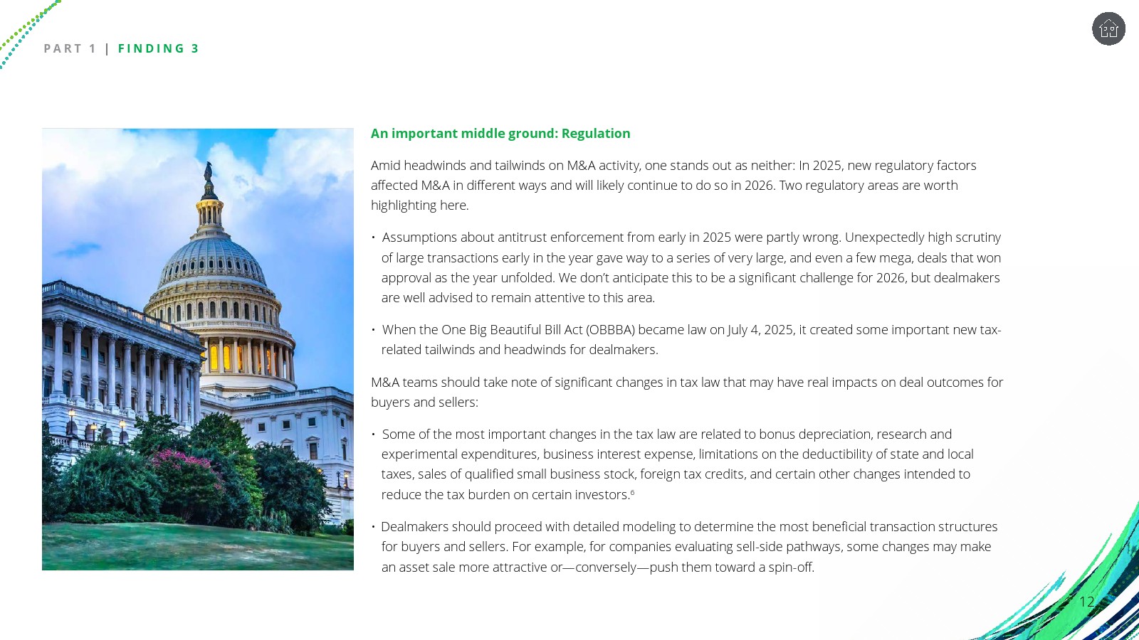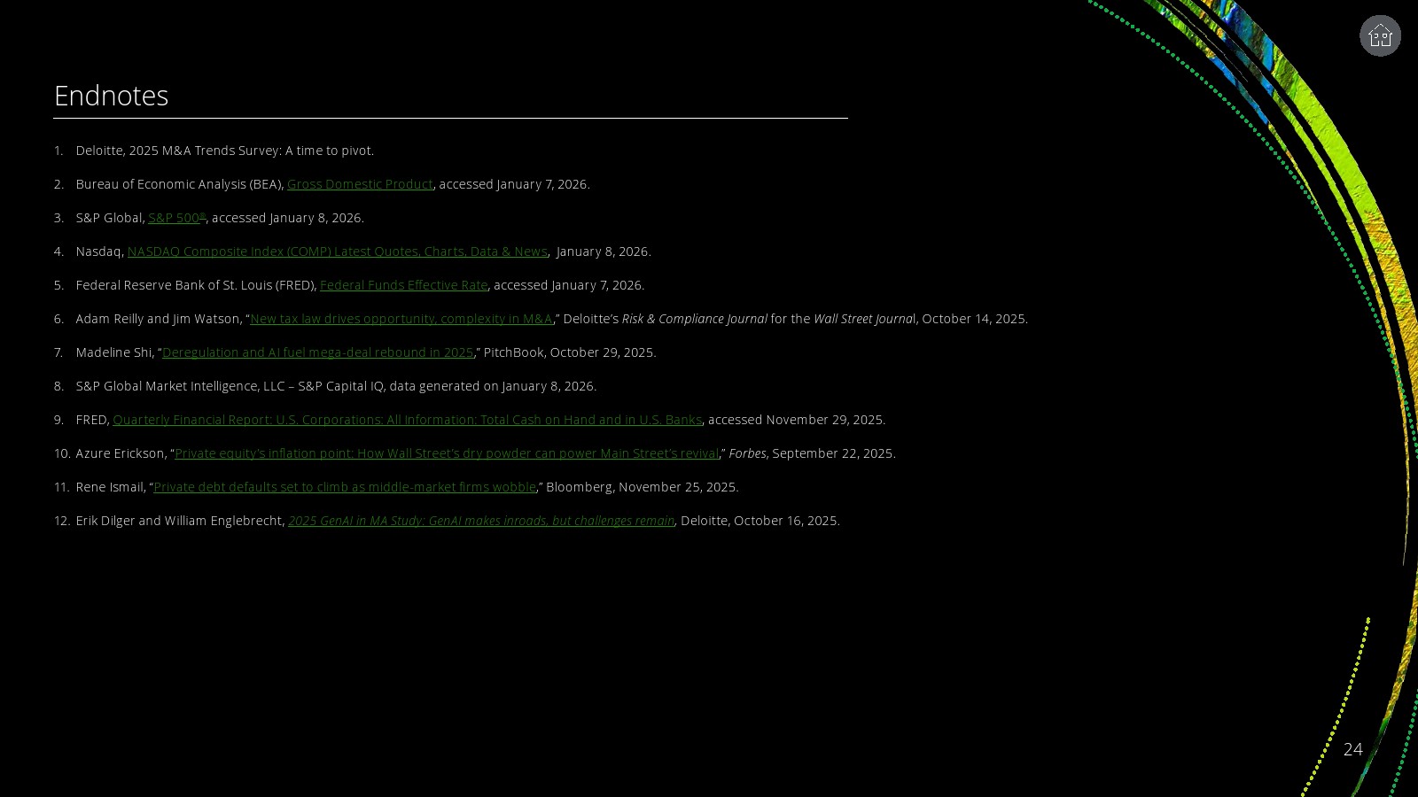 宏观经济信号呈现典型的“顺风与逆风并存”。美国GDP在2025年第一季度收缩0.6%后,第二季度与第三季度分别反弹至3.8%和4.3%。股市表现强劲,标普500全年上涨15.8%,纳斯达克上涨19.6%。并购市场价值亦在下半年明显反弹,季度交易额从上半年的约3900亿美元升至第四季度的7141亿美元。