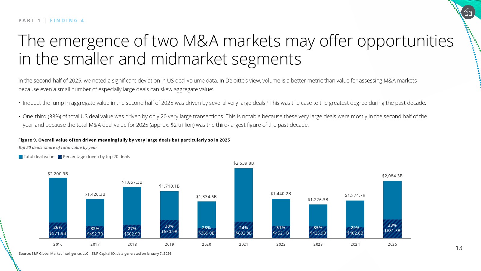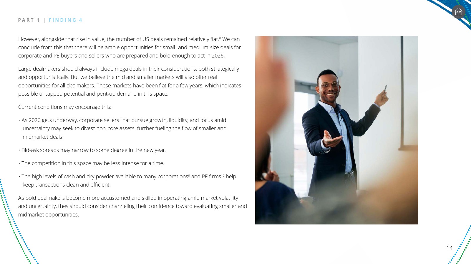 这种结构为中型与中小规模并购提供新的机会。企业在不确定环境下更倾向于剥离非核心资产以提升流动性,而私募基金与企业仍拥有大量“干火药”资金储备。竞价压力相对较低、估值差距逐步收敛,使中端市场可能成为2026年并购活动最活跃的区间。