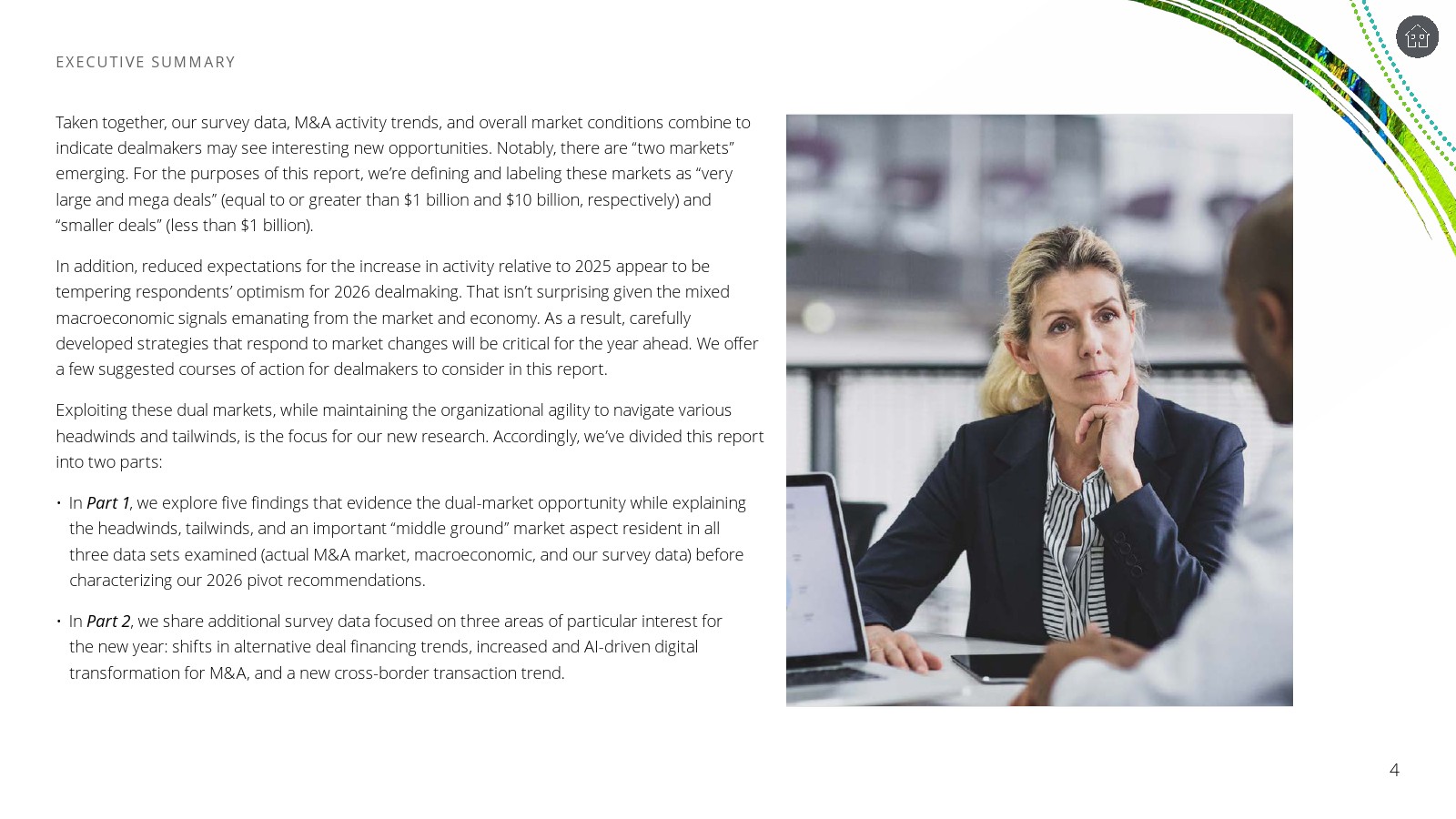 整体来看,2026年的并购市场将呈现更强的结构分化与策略灵活性。一方面,巨型交易仍可能在科技和产业整合驱动下出现;另一方面,中型和中小交易将成为更稳定的增长来源。在利率、地缘政治与技术革命交织的环境下,具备快速调整能力、融资结构创新能力以及技术整合能力的企业,将更可能在新一轮并购周期中获得超额价值。