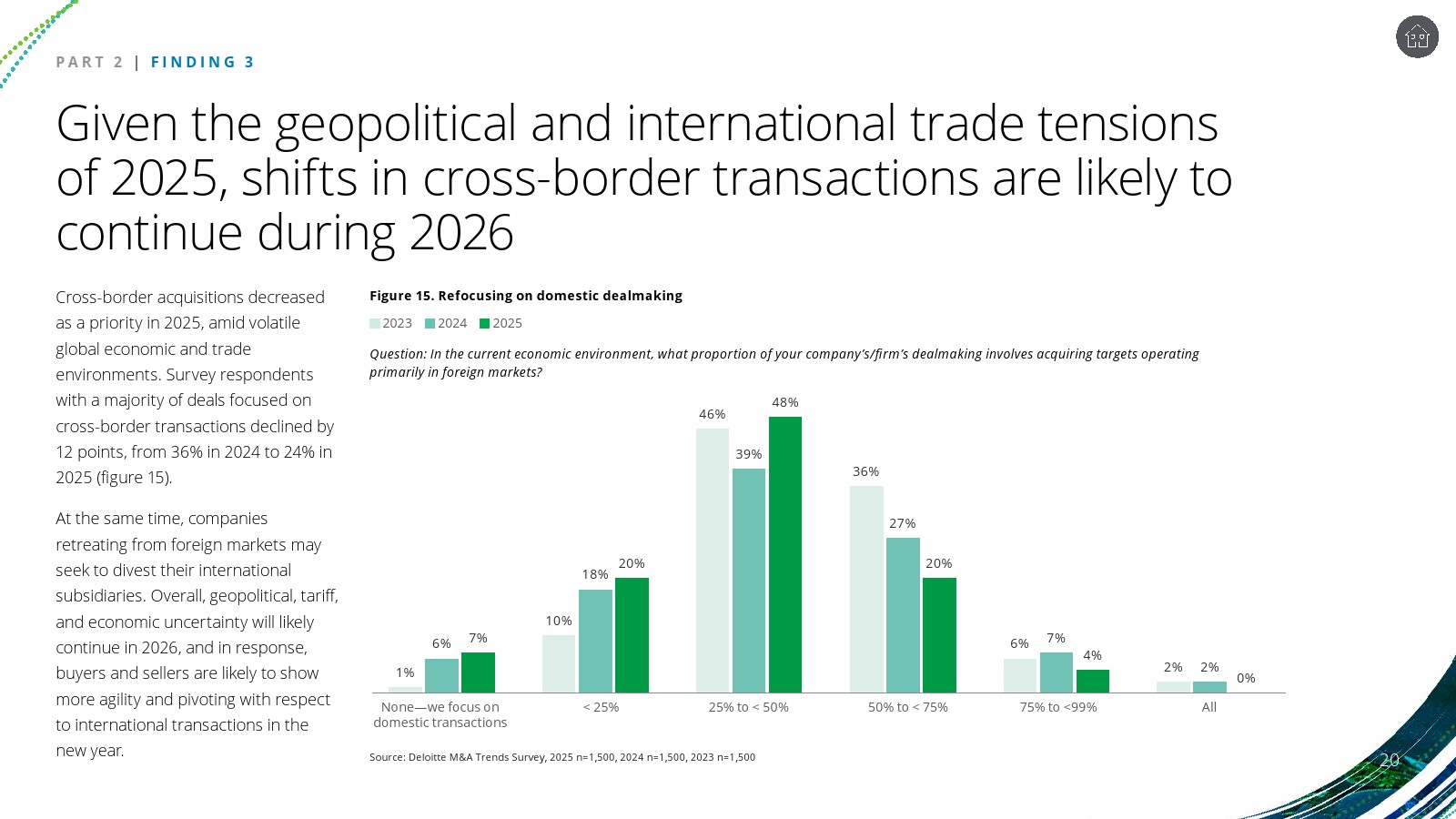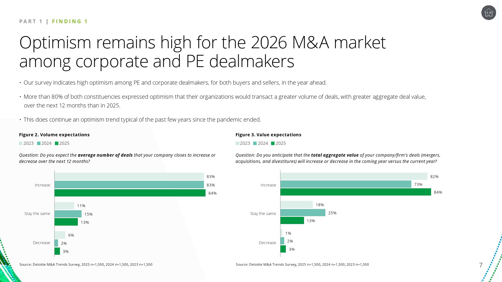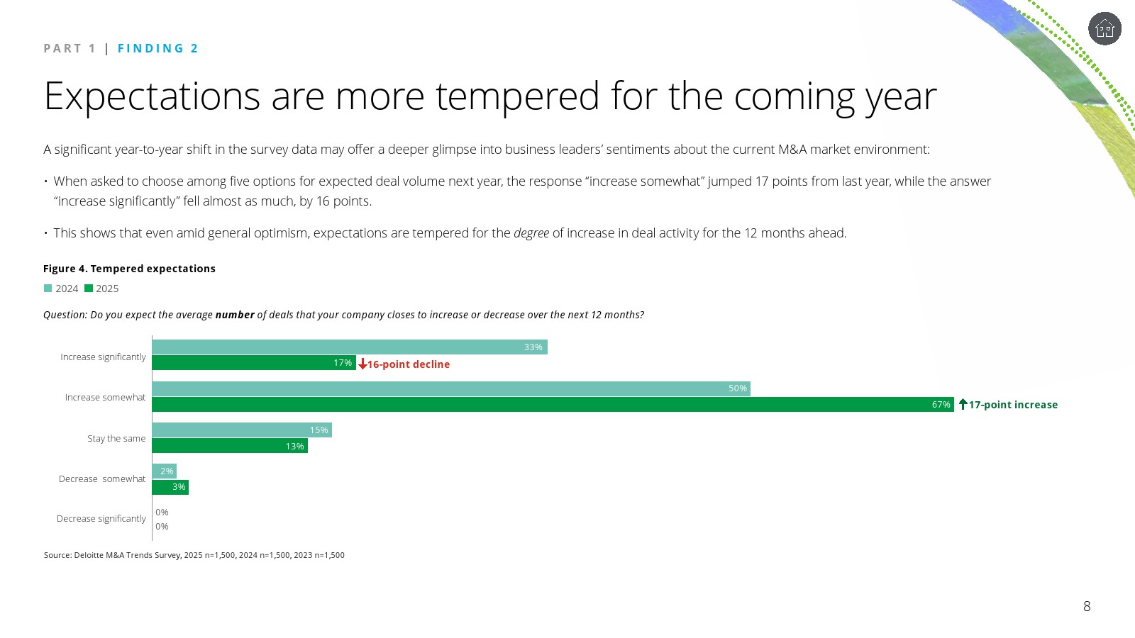 尽管整体情绪偏乐观,企业对增长幅度的预期明显趋于谨慎。调查中“交易量显著增长”的预期较上一年下降16个百分点,而“适度增长”的预期上升17个百分点。这种预期收敛反映出企业在复杂宏观环境下更倾向于渐进式扩张,而非激进的并购周期。