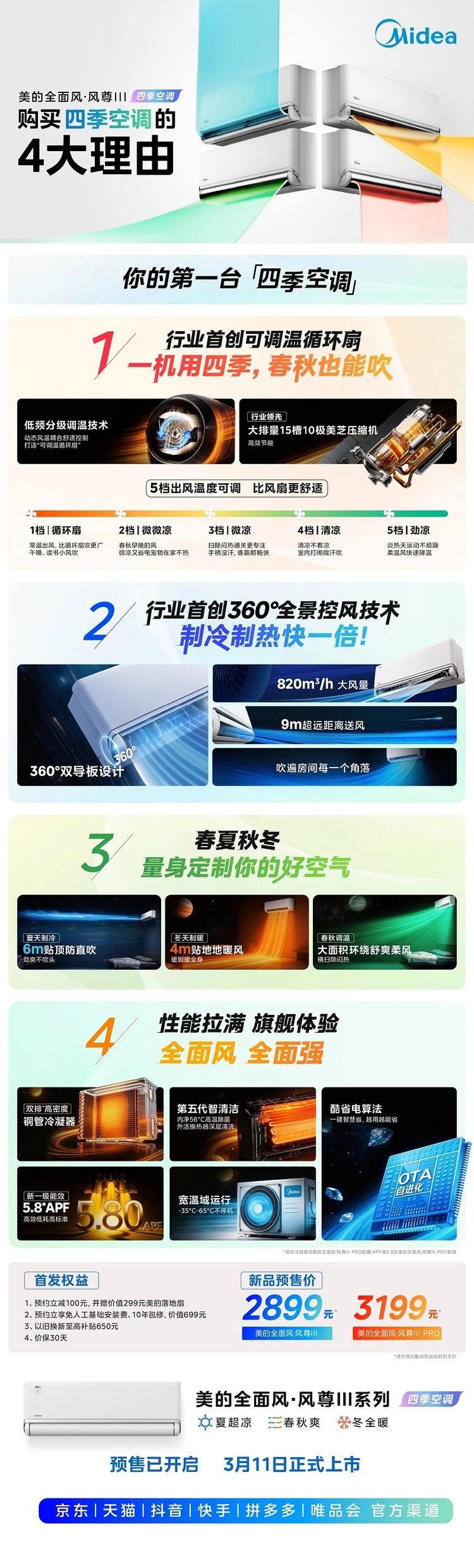 为让消费者更好体验“四季空调”带来的生活品质升级,即日起,美的全面风·风尊三代空调特推出多重权益助力换新:首发28小时内购机立减100元、到手低至2899元、免人工基础安装、10年整机包修(含4年压缩机延保)无忧服务。参与以旧换新至高可享650元补贴,更有30天价保承诺。