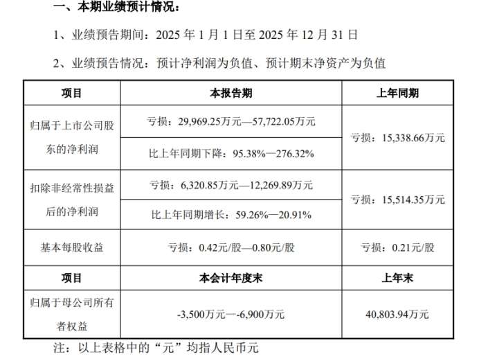 2025年预亏3亿元至5.77亿元 可能被实施退市风险警示