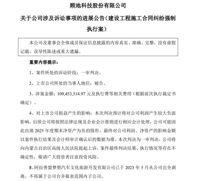 根据公告,顾地科技被追加为(2021)内 29 执 26 号宁夏建工与梦想汽车建设工程施工合同纠纷一案的被执行人;顾地科技对第三人梦想汽车在(2020)内29民初64号民事调解书中欠付宁夏建工的债务承担连带清偿责任。此次涉案金额为1.09亿元及执行费等相关费用。顾地科技称,本次判决预计将对公司利润产生较大负面影响,公司可能因此出现2025年度期末净资产为负的情形。本次判决为一审判决,公司将向内蒙古自治区高级人民法院提起上诉,案件最终判决结果、执行情况等存在不确定性。