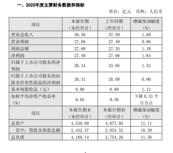 业绩快报显示,2025年厦门银行的营收净利润均实现增长,全年实现营业收入58.56亿元,同比增长1.69%;利润总额27.68亿元,同比增长1.18%;净利润27.50亿元,同比增长1.64%;归属于上市公司股东的净利润26.34亿元,同比增长1.52%,基本每股收益0.90元,同比增长1.12%。较2024年的增收不增利相比,利润恢复增长。