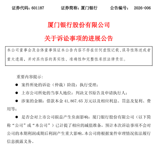在此之前,厦门银行已对该金融借款合同纠纷案的相关进展进行了多次披露,该行也表示,除已披露诉讼事项外,不存在其他应披露而未披露的重大诉讼、仲裁事项。针对该笔涉案贷款,厦门银行已提前计提相应减值准备,预计本次诉讼事项不会对公司本期利润或期后利润产生重大影响,后续公司也将根据案件审理情况依法履行信息披露义务。