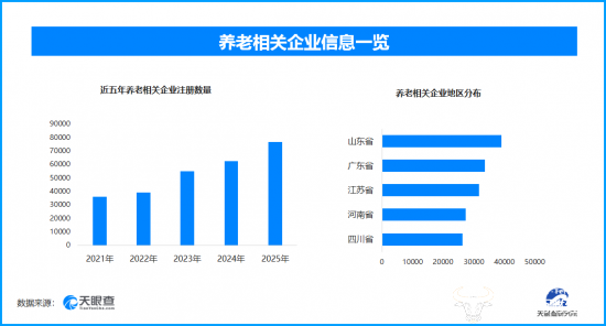 从区域分布来看,山东省、广东省、江苏省养老相关企业数量位居前列,分别为超3.9万余家、3.3万余家和3.1万余家。排在其后的是河南省和四川省。