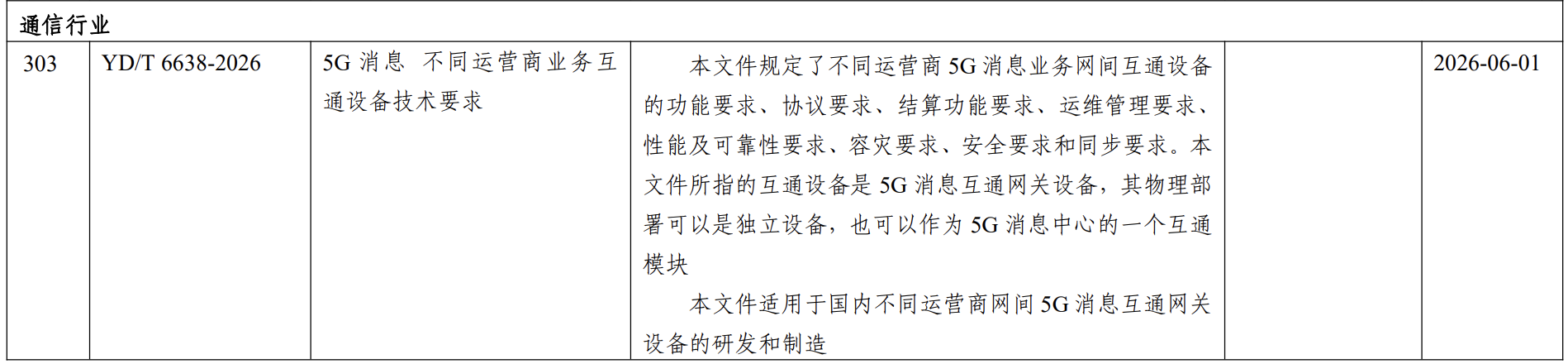 C114讯 3月11日消息 据中华人民共和国工业和信息化部公告2026年第3号显示,工业和信息化部批准《5G消息 不同运营商业务互通设备技术要求》等453项行业标准。