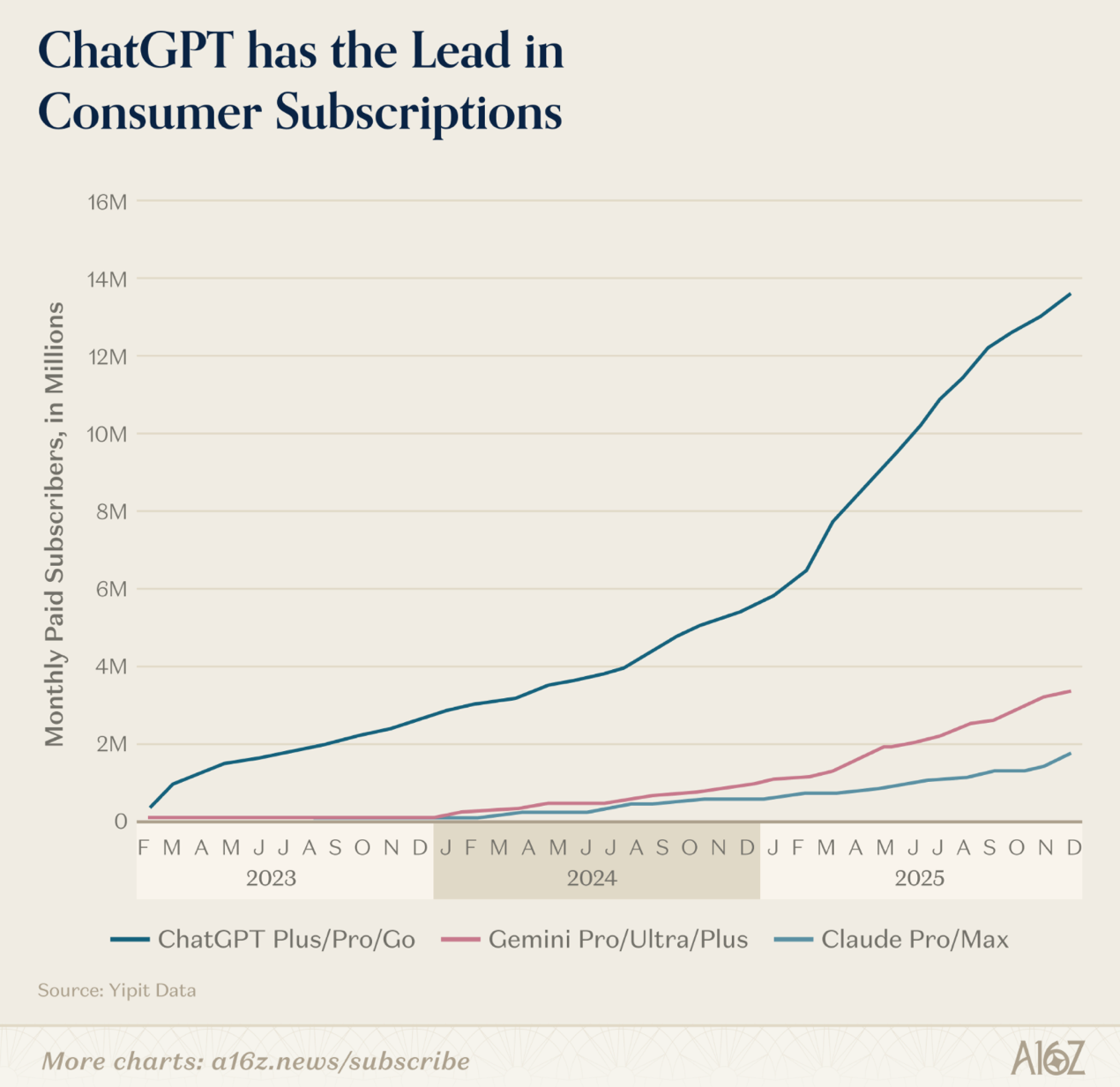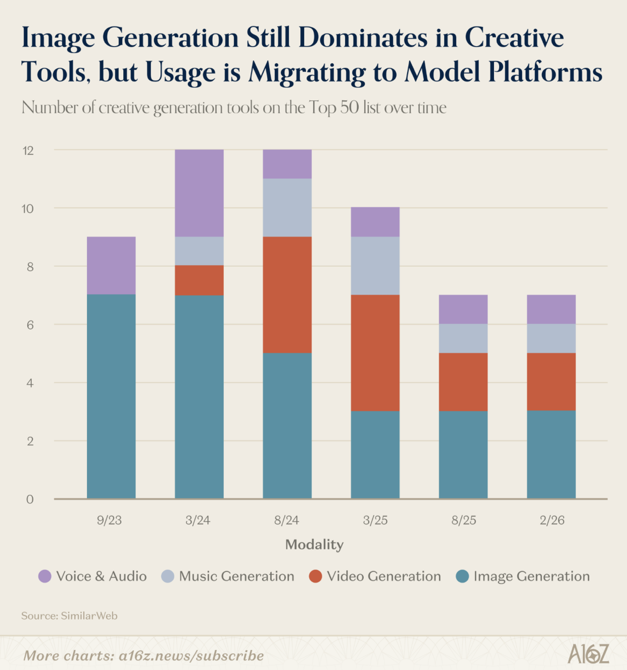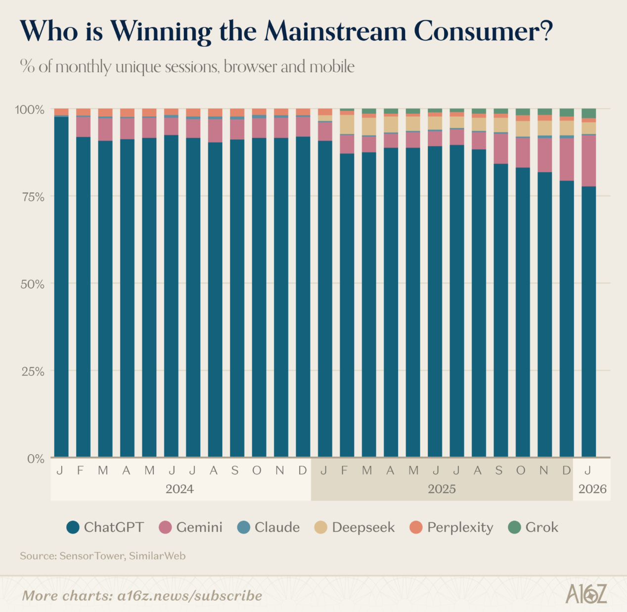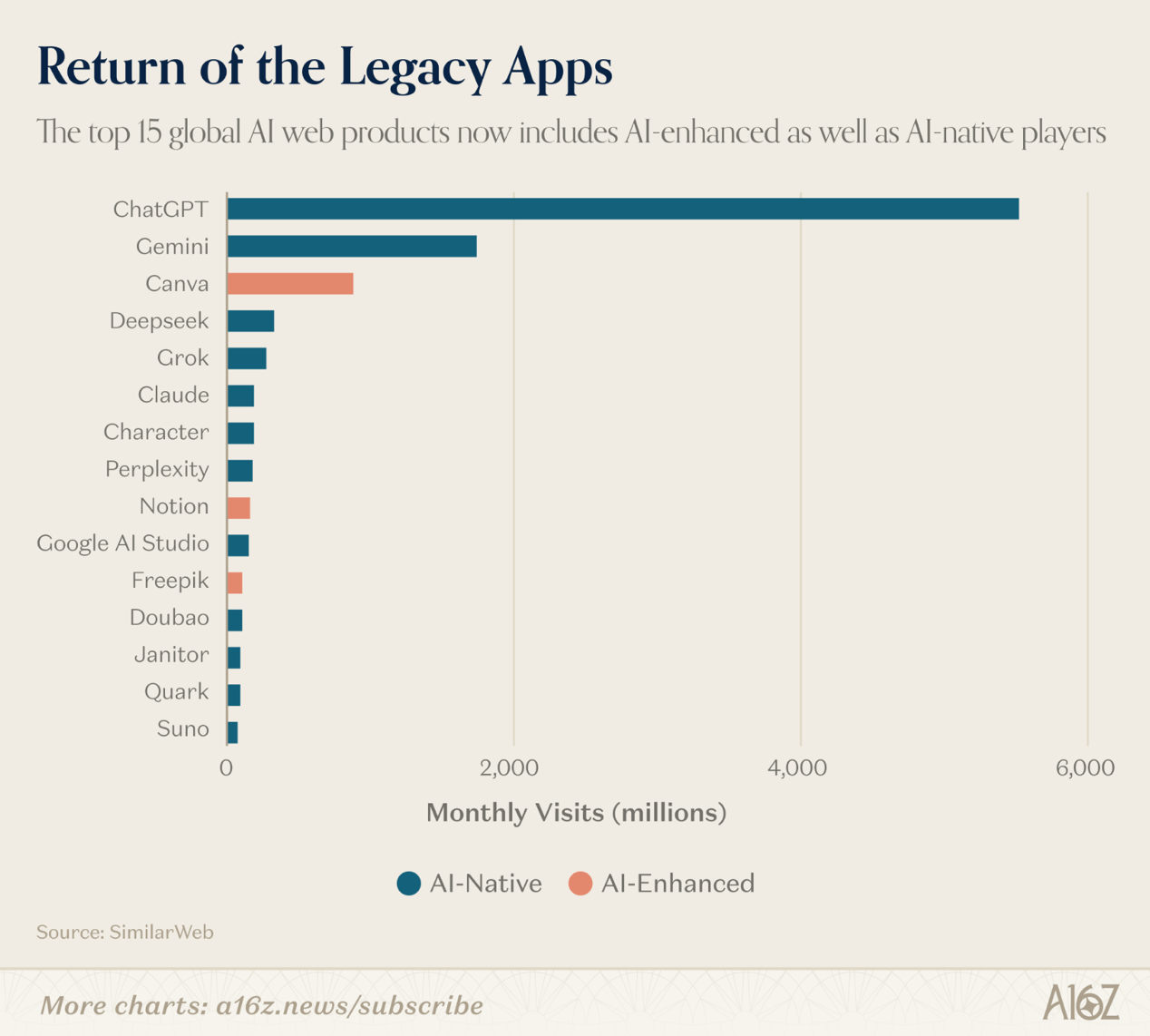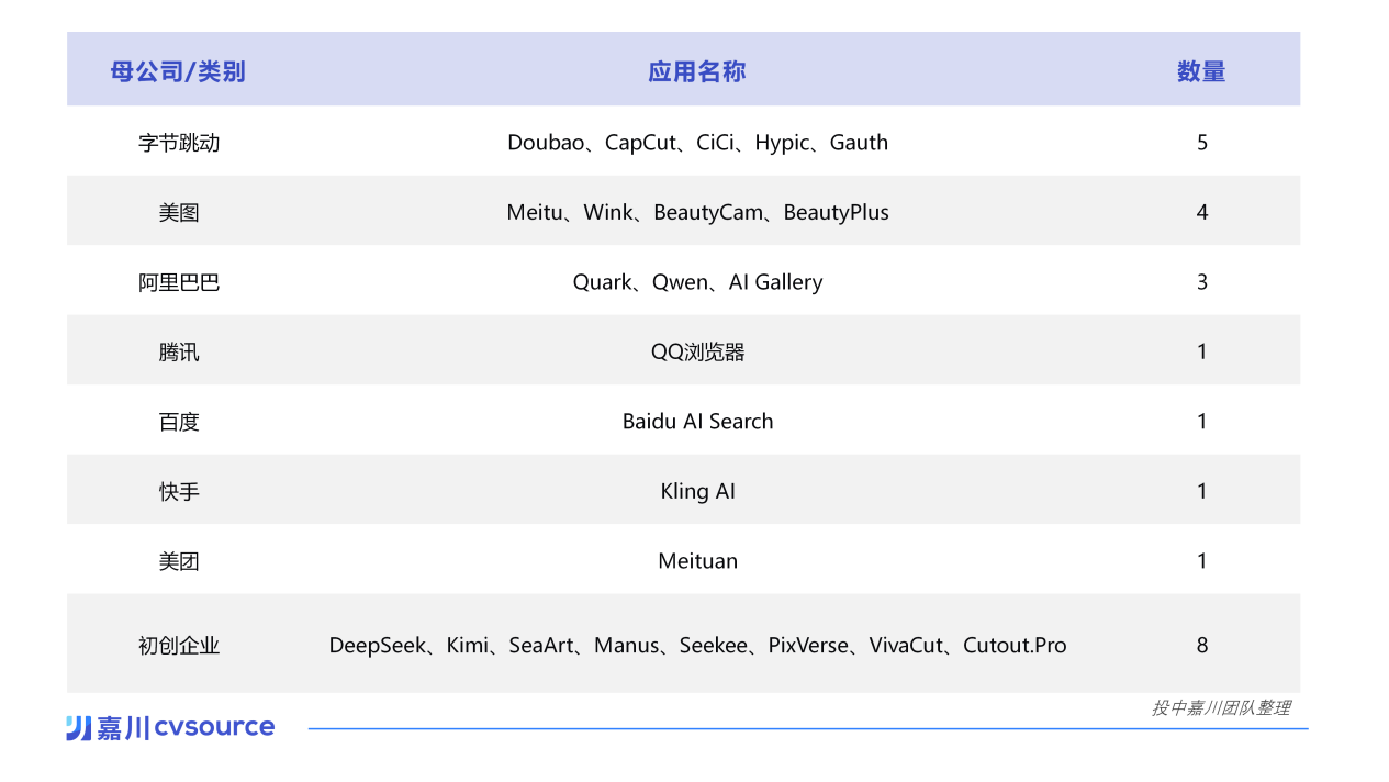 今年初,投中嘉川发布了一篇关于国内AI应用的文章《一个月50多家公司被投资,这个赛道已经火了》。文中提到了最近几年国内的投资情况:自2022年以来,全国新成立了788家AI应用公司。2025年有577家相关公司完成融资,而且仅今年1月,有50多家公司被下注,很明显AI投资的重心,正在从投大模型向应用扩散。而就在本周,美国知名投资机构a16z发布了《The Top 100 Gen AI Consumer Apps — 6th Edition》。这份报告释放了一个重要的信号:消费级AI市场,正在从“独立AI应用竞争”,走向“AI平台、AI功能与传统超级应用共存竞争”的新阶段。也就是说AI应用,不止着眼于那些“AI-first”的原生产品,而也应该把传统应用也一起纳入视野。这意味着AI不再只是一个新赛道,而是正成为传统消费互联网各类产品的基础能力。而且这份报告有24个中国系应用入选,占到了四分之一的份额。涉及阿里、美团、字节等互联网巨头和Kimi、deepseek等多家初创企业。值得注意的是,在a16z 25年8月发布的《Top 100 Gen AI Consumer Apps — 5th edition》中,去重后约有 29 个中国系应用上榜,高于第六版的24 个。很明显,中国系公司不再局限于单一模型能力,而是在视频、图像、搜索、工具和本地生活等多类消费场景中形成了更完整的产品矩阵。这与国内投资数据上的增长也形成了鲜明的呼应。01.ChatGPT依然领先,但“AI入口”之争已经开始谁是最大的AI应用?答案依然是ChatGPT。从网页端看,ChatGPT的流量规模仍约为第二名Gemini的 2.7倍;从移动端看,其流量规模约为Gemini的 2.5倍。与此同时,OpenAI披露ChatGPT周活跃用户已达到 9亿,较过去一年增加 5亿。a16z还指出,如今每周使用ChatGPT的人数已经超过全球人口的10%。不过在A16Z看来,市场不再只是一家独大的静态格局,各方在AI入口方面的竞争正愈演愈烈。a16z援引 Yipit Data 数据称,截至2026年1月,Claude美国付费订阅用户同比增长已超过 200%,Gemini则达到 258%。此外,大约 20% 的ChatGPT网页周活跃用户,在同一周内也会使用Gemini。这说明消费级AI市场没有像传统互联网搜索引擎那样迅速走向“单一赢家通吃”,而是出现了明显的多平台并用特征。而且ChatGPT和Gemini这两大平台还表现出了不一样的扩张策略。ChatGPT的应用目录已包含 13个类别、220个应用;Claude则拥有约160个官方筛选连接器 和约50个社区构建的MCP。两者重合的应用仅有 41个,约占合并目录的 11%。这说明ChatGPT正在向更广泛的消费场景渗透,包括旅行、购物、餐饮、健康、生活方式和娱乐等领域;Claude则更偏向专业用户和高价值知识工作场景,其独有集成更多集中在金融终端、开发基础设施、科研与医疗工具等方向。不过归根到底,两者竞争正在从“哪个模型回答得更好”,转向“哪个模型更有机会成为用户的默认操作层”。a16z认为,真正的壁垒来自于上下文积累、身份体系、连接器生态与第三方工作流集成。02.中国24款产品上榜,传统互联网与初创企业平分秋色涉及到中国市场的内容,则在第二部分。a16z在榜单第二部分提出了一个很重要的观察:全球AI消费市场正在分化为三个相对独立的生态——西方生态、中国生态和俄罗斯生态。欧美产品方面,ChatGPT、Claude、Gemini、Perplexity的主要市场高度相似,聚焦于美国、印度、巴西、英国和印尼等国家。而俄罗斯市场中,整合了 Alice AI 助手的 Yandex Browser 已达到 7100万月活,跻身全球移动端AI产品前十。在中国市场,按母公司或创始团队的中国背景这一较保守口径来统计,a16z本期 Top 100 榜单中,有 24个中国系应用入选,占到了全榜单的四分之一。见下表这24款应用从侧面说明两个问题:第一,中国厂商在消费级AI领域的存在感已经不只体现在大模型本身,而是同时覆盖了聊天助手、内容创作、视频编辑、搜索工具、本地生活与图像美化等多个高频场景,形成了更完整的产品矩阵。第二,字节、阿里、美图等传统互联网公司仍然是中流砥柱,特别是美团的表现十分强劲。此外,这24款应用中有8家来自创业公司。除了Deepseek、Kimi、Manus这三家知名度最高的公司外,其余5家公司更值得关注。SeaArt是成都一家AI公司,海艺AI。创始人马飞是成都最早一批涉足手游出海的创业者。曾参与《银河帝国》等游戏的开发。据我所知,海艺AI已经完成两轮融资,不过目前未对外披露投资方。Seekee主打搜索功能,支持用文字、语音及图片方式输入搜索内容。创始人周为民,也是人人视频的创始人。他还曾创立了海外流媒体平台Loklok。PixVerse 爱诗科技则是在近期完成了3亿元的C轮融资,投资方为鼎晖、中国儒意、三七互娱等。这笔交易也刷新了中国视频生成领域的最大单笔融资。VivaCut和Cutout.Pro则都来自杭州。VivaCut是视频编辑AI应用,曾获得创新工场等机构的投资。Cutout.Pro则是AI图片应用,获得杭高投等机构的注资。值得一提是,A16Z评价中国应用时说,字节豆包和Kimi等公司存在感较强;DeepSeek则是一个特殊案例,它是少数“跨区穿透”的AI公司。其网页流量中约 33.5% 来自中国,7.1% 来自俄罗斯,6.6% 来自美国。它打破了美、中、俄三个生态相互隔绝的界限。03.AI重心从图像走向视频、音乐和语音这一轮AI应用最活跃的变化发生在视频生成。a16z点名了可灵AI、海螺、Pixverse 等产品,认为它们已形成真实用户牵引,而且中国视频模型在输出质量上整体保持领先。Google的 Veo 3 则被a16z视作首个真正缩小中美差距的美国视频模型,
