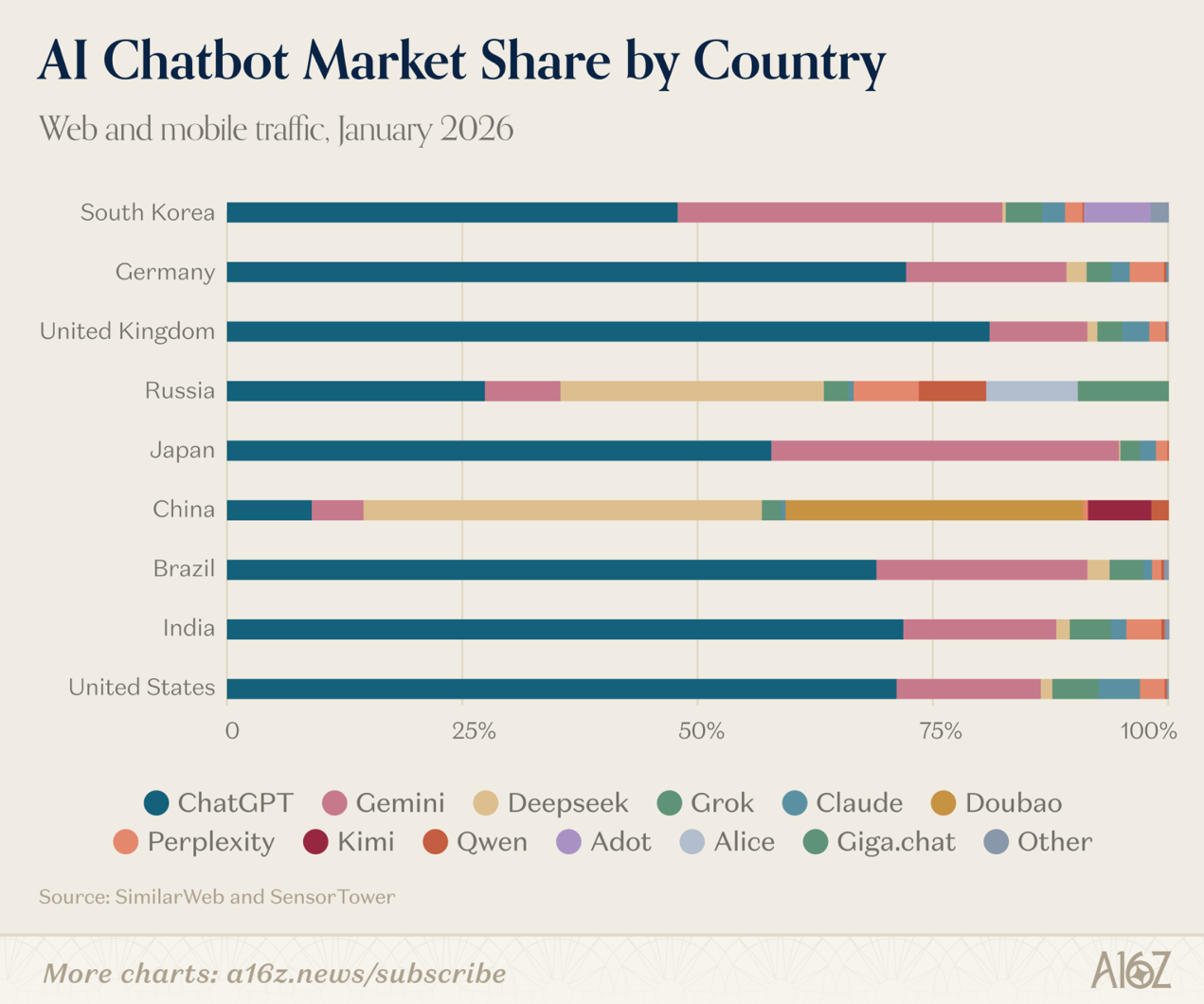 a16z最新一版AI应用榜单显示,消费级AI的竞争正在发生明显变化:一边是ChatGPT继续领先,但默认入口之争已经展开;另一边是中国、美国、俄罗斯等市场加速分化,区域性生态更加清晰。