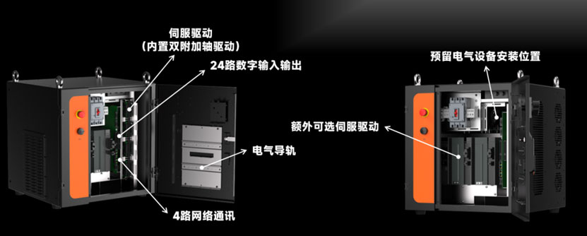 采用模块化驱控一体设计,整柜IP54防护等级,无惧油污粉尘。标配24路数字输入输出、4路网络接口,预留充足电气安装空间。
