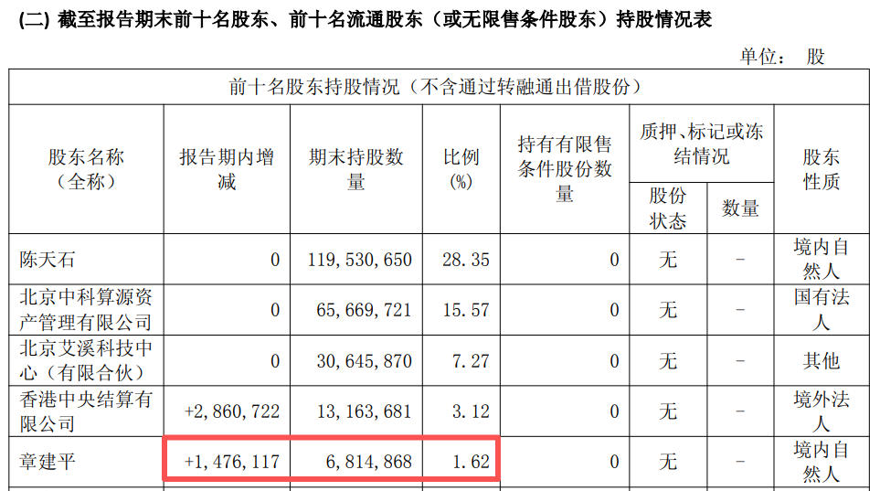 值得注意的是,年报显示,章建平期内增持寒武纪,期末持股数量为681.49万股,占流通比例1.62%,为第五大股东。按3月12日1099元/股的收盘价1099元,章建平持仓金额近75亿元。