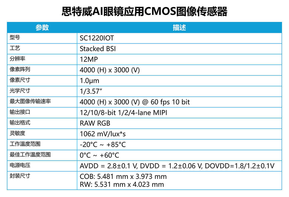 作为1200万像素1/3.57英寸CMOS图像传感器,SC1220IOT基于思特威SmartClarity®-XL技术平台打造,采用全流程国产Stacked BSI先进工艺技术,其封装尺寸仅约5.48mm x 3.97mm,可灵活适用于AI眼镜及AR/VR设备等多种智能穿戴设备的微型摄像头模组,满足智能穿戴设备兼顾成像性能升级与轻量化设计的应用需求。