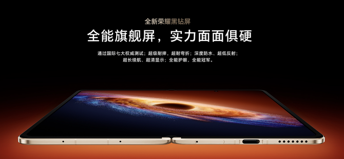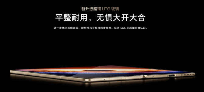 内屏则采用新升级的超韧UTG玻璃,峰值亮度为5000nits,同样支持4320Hz PWM高频调光与1.5%超低反射率,由抗反射AR保护层、UTG玻璃抗冲击层以及碳纤维支撑层构成,抗冲击力提升33%,内外屏均支持手写笔操作,无论是办公记笔记,还是随手涂鸦,都能带来流畅的书写体验。展开后的内屏尺寸宽大,配合PC级三分屏设计,可同时铺开会议窗口、聊天窗口和资料窗口,切换、拖拽和堆叠更加连贯,大幅提升信息处理效率,真正发挥折叠屏的生产力优势。