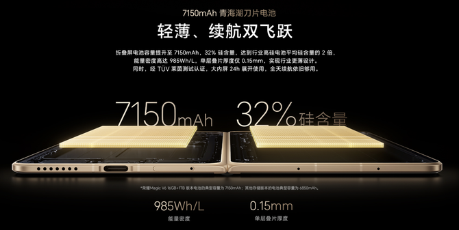 续航方面,荣耀Magic V6更是刷新了折叠屏行业纪录,16GB+1TB顶配版本搭载新一代青海湖刀片电池,典型值高达7150mAh,其他版本也达到6850mAh,配合高硅含量、高能量密度的技术优势,一举打破容量、含硅量、厚度、能量密度在内的四项行业纪录,彻底告别折叠屏续航焦虑。此外,全系支持80W有线快充和66W无线超级快充,半小时可充至59%,约60分钟即可完全充满,搭配全系标配的120W荣耀魔方全能充电头,兼容多品牌设备充电协议,真正实现“一头在手,全能快充”,彻底解决了大电池充电慢的痛点。