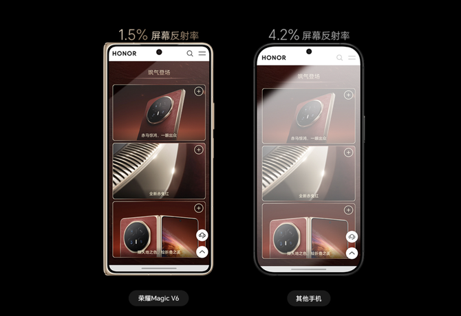 荣耀Magic V6配备内外双“至臻黑钻屏”,外屏最窄黑边仅1.18mm,实现四边等窄效果,比例和边框控制向直板旗舰靠拢,闭合状态下正面观感十分完整,日常高频操作如回复消息、刷短视频,无需展开内屏,使用起来和直板机一样顺手。外屏采用新一代金刚巨犀玻璃,峰值亮度达到6000nits,支持4320Hz PWM高频调光,每块屏幕表面镀有5600层氮化硅低反涂层,防磨性能提升3倍,反射率低至1.5%,即便在强光下也能清晰显示,同时有效减少屏幕反光和指纹残留。