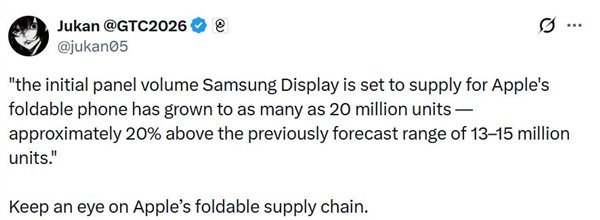 快科技3月13日消息,根据供应链消息,三星为苹果首款折叠屏iPhone Fold供应的首批面板订单数量出现了显著增长。目前订单量已增至2000万片,比之前预测的数值高出约20%。