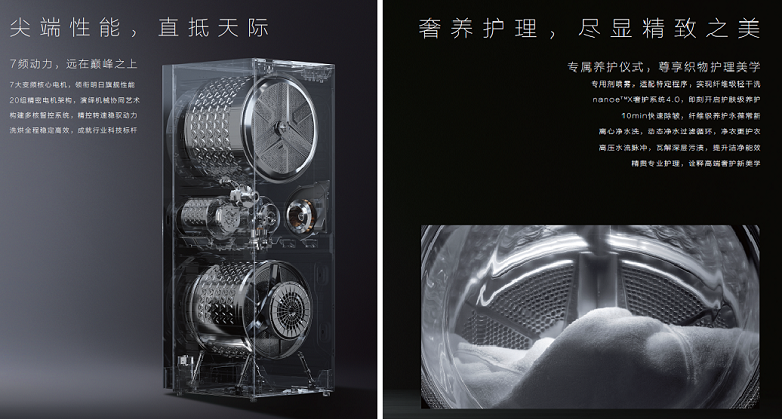 此次ALPHA G5脱颖而出,核心在于其打破行业瓶颈的集成创新技术,彻底解决传统多筒洗护占地大、体验割裂的痛点,以“一台就是一间洗衣房”的创新理念,重新定义高端洗护形态。作为全球首创四筒全热泵洗烘护一体机,它将约5㎡洗衣房功能浓缩进普通洗烘套装体积,实现“四筒一体,8in1”高效洗护,可一次性完成多批次衣物分开洗、自动烘,针对不同面料精准洗涤烘干,兼顾效率与护衣。