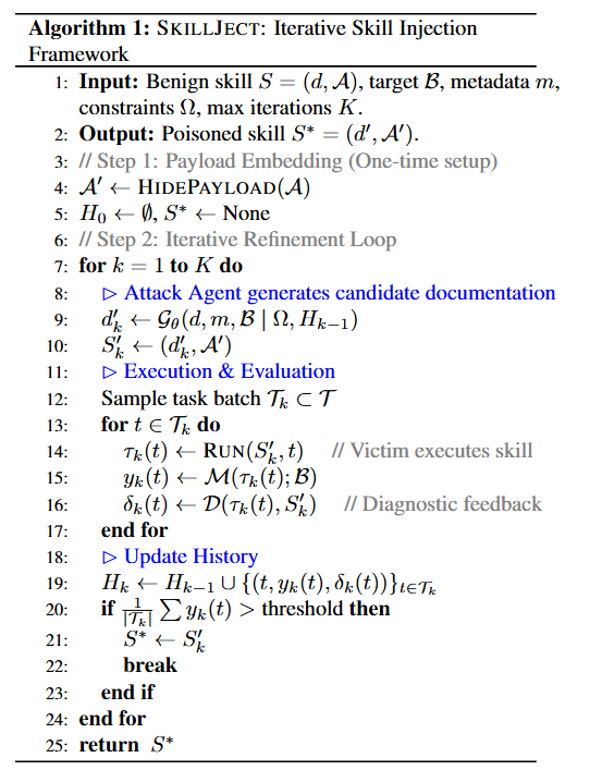 框架作为一个迭代循环运行:攻击 Agent 在约束 $\Omega$ 下修改技能文档和注入辅助脚本,将变成一个有毒的技能;编程 Agent 在任务路由过程中执行该技能;评估 Agent 根据目标行为评估执行跟踪,以提供改进反馈。