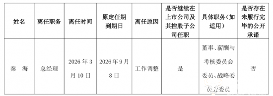 公告显示,因工作调整原因,秦海申请辞任公司总经理职务。秦海出生于1968年,今年58岁,其总经理一职的原定任期到期日为今年9月8日,也就是说,秦海是提前半年左右卸任的。而接任秦海总经理一职的为杨照兵。