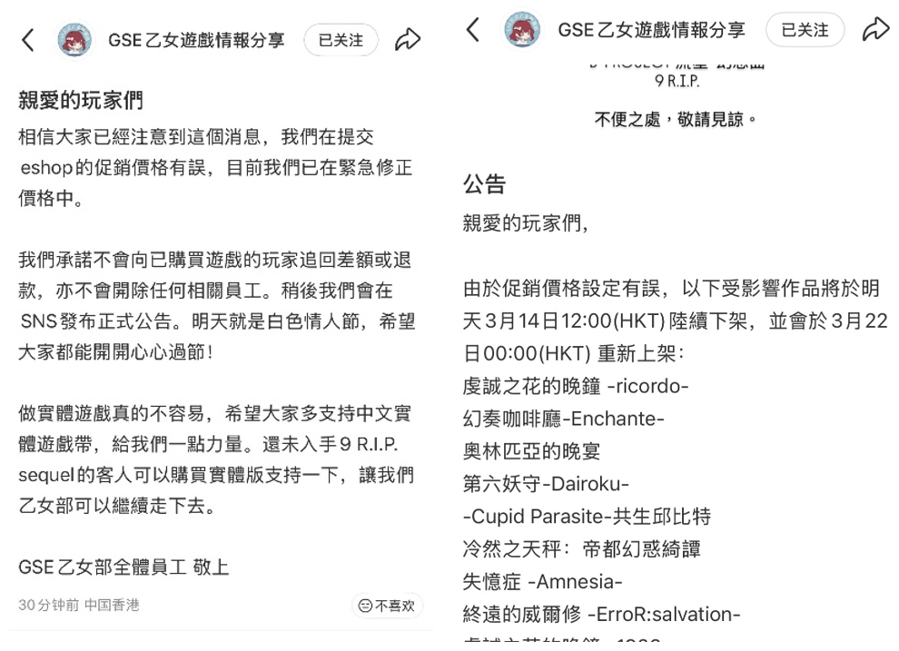 什么排雷安利也不管了,先买上了再说就在几小时前,GSE乙女部官方发布了公告,表示提交eShop的促销价格有误,已经在紧急修复当中。根据最新的官方消息显示,这些受影响的作品将在3月14日(明日)中午12点下架,于3月22日重新上架。