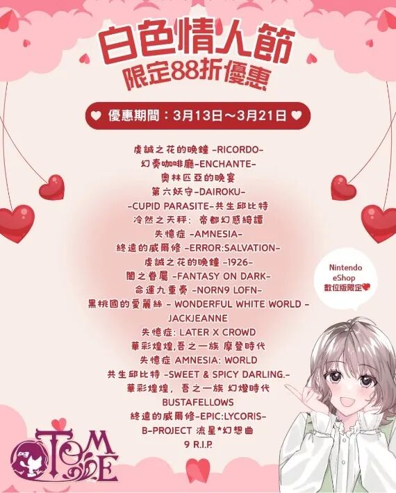 昨天,香港发行商GSE公布了任天堂eShop白色情人节期间的促销折扣。从3月13到3月21的一周时间内,玩家可以享受下图在内,共计22部日本乙女游戏的88折折扣。