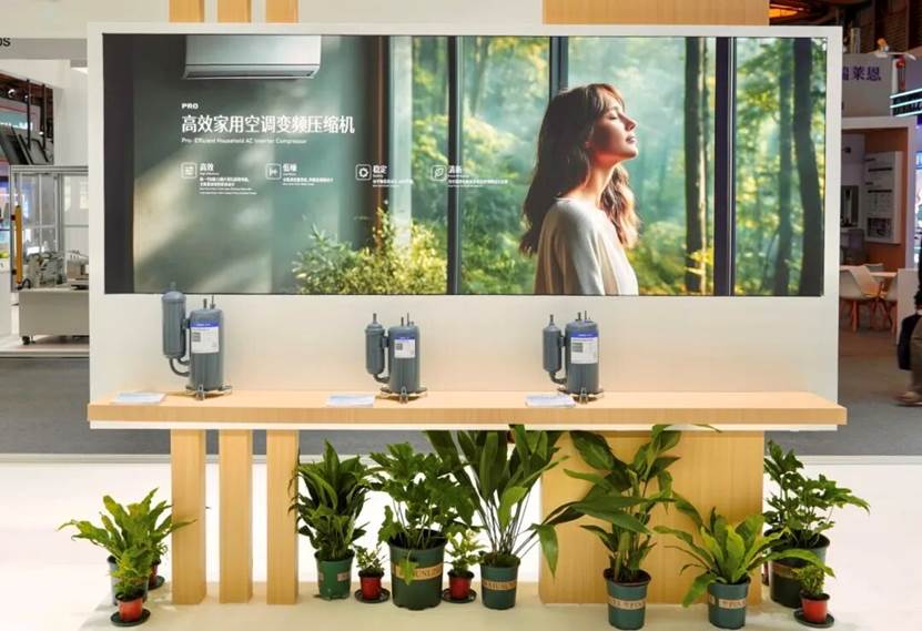 在家用领域,海立展出一系列精准匹配多元化需求的创新产品。针对极端高温环境设计的中东(热带)空调压缩机,制冷能力显著提升;高端家用空调双缸变频压缩机以“双核运转矩如羽,冷暖无声润四季”为核心卖点,集成静音减振技术,高温环境下制冷效率提升15%;超高效家用空调变频压缩机与小型化家用空调压缩机分别聚焦能效升级与空间优化,满足不同户型、不同使用场景的家居需求;R290家用空调压缩机则采用环保冷媒,为绿色家电普及提供核心支撑。